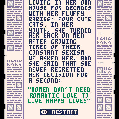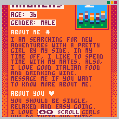 | Tags | Adult, No AI, PICO-8, Pixel Art, Retro, Short, Singleplayer, Story Rich |