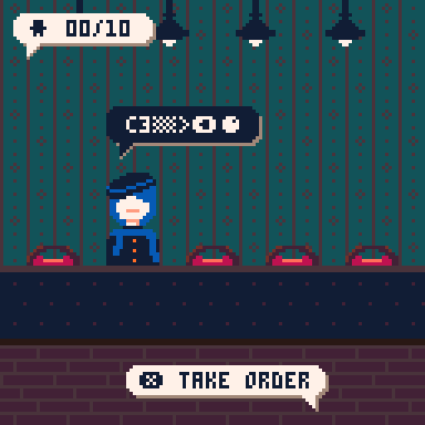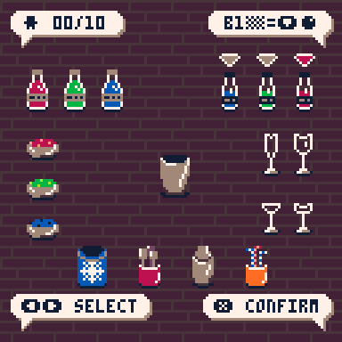 The "X" button in the game corresponds to the "X" on the keyboard. For the direction keys, you can use the arrows on your keyboard. Take orders by pressing "X". Press the arrow keys when mixing a drink to choose your ingredients. The red arrow indicates the currently selected ingredient, while the white arrows indicate the potential ingredients. After serving the drinks, the agents will let you know which part of their order was executed correctly (red = bad, green = good).