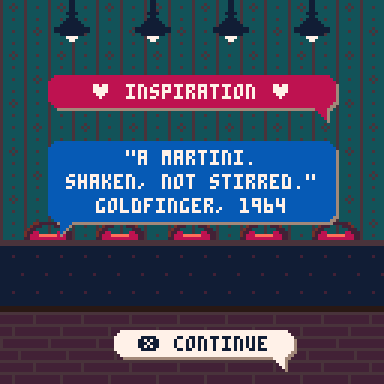 This game was made for Trijam #365 with the theme "game from a movie quote". My game is inspired by the quote "A martini. Shaken, not stirred." from an old James Bond movie. Sadly, I started way too late and the development took me about 9 hours. Unfortunately, I did not have time for sound.